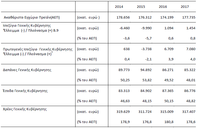 • Οι δαπάνες της Γενικής Κυβέρνησης μειώθηκαν σε 85,322 δισ. ευρώ (48,01% του ΑΕΠ) από 86,271 δισ. ευρώ (49,52% του ΑΕΠ) το 2016.