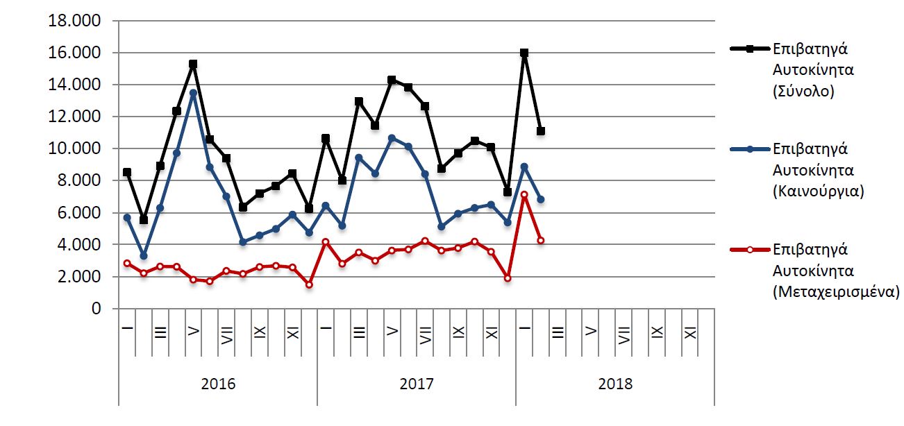 Το δίμηνο Ιανουαρίου- Φεβρουαρίου 2018 κυκλοφόρησαν για πρώτη φορά 32.214 αυτοκίνητα (καινούργια ή μεταχειρισμένα εξωτερικού) έναντι 23.102 που κυκλοφόρησαν την αντίστοιχη περίοδο του έτους 2017, παρουσιάζοντας αύξηση 39,4 %. Τα καινούργια αυτοκίνητα ανέρχονται σε 16.967 έναντι 12.909 που κυκλοφόρησαν α’ δίμηνο του 2017, παρουσιάζοντας αύξηση 31,4%.