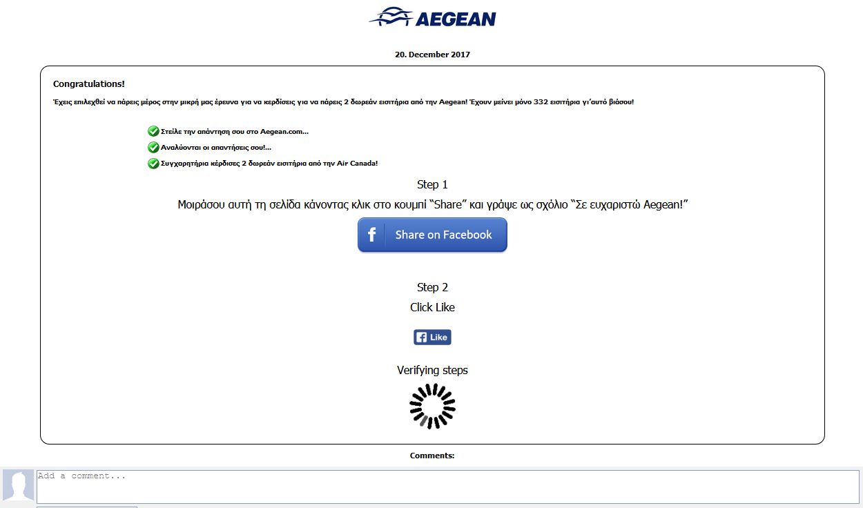 Η Aegean Airlines με ανακοίνωσή της στο facebook κάνει λόγο για ψευδή και παραπλανητικό διαγωνισμό. Η αεροπορική εταιρεία εφιστά την προσοχή των καταναλωτών και τους καλεί να μην πατήσουν κανέναν σύνδεσμο, ούτε να τον μοιραστούν με φίλους.
